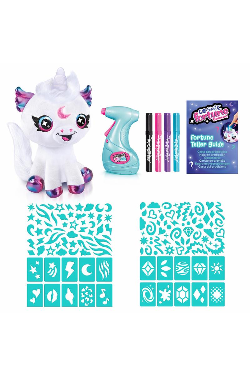 Oppdag fremtiden din! Still enhjørningen et Ja eller Nei-spørsmål og trykk på hornet. Utrolig, den lyser opp! Se på spådomsguiden for å tyde svaret.For å designe og tilpasse plysj, bruk sjablonger til å fargelegge trendy ikoner eller bli kreativ og fristil. Bare klistre sjablonger på plysj, velg en farge og spray med airbrush - og når du er klar for et nytt design er det bare å vaske plysjen og begynne å dekorere igjen.