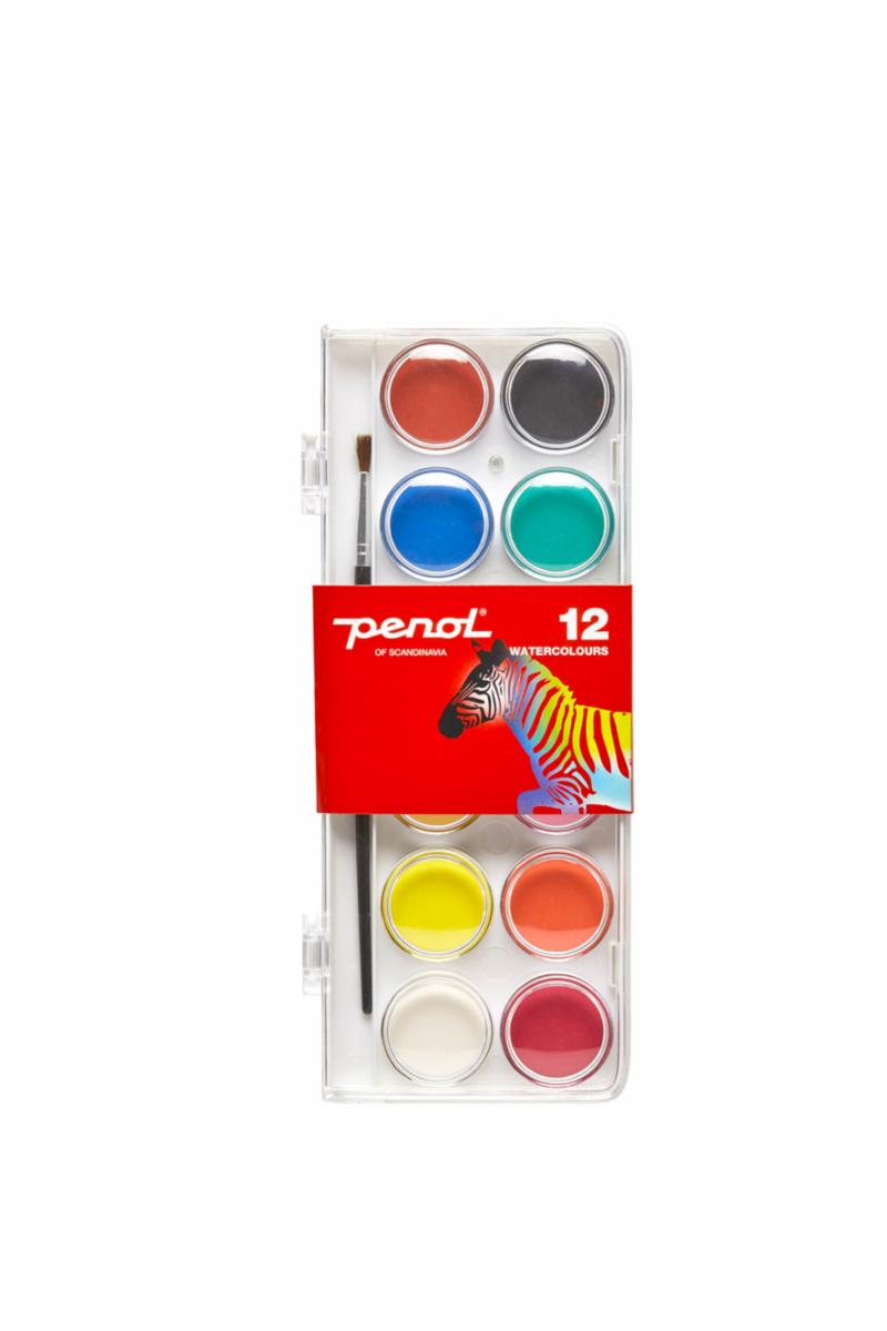 Maleskrin fåes i flere størrelser og inneholder klare, dekkende vannfarger. Alle skrin inneholder pensel. Meget høy kvalitet på fargetablettene. 12 farger.
