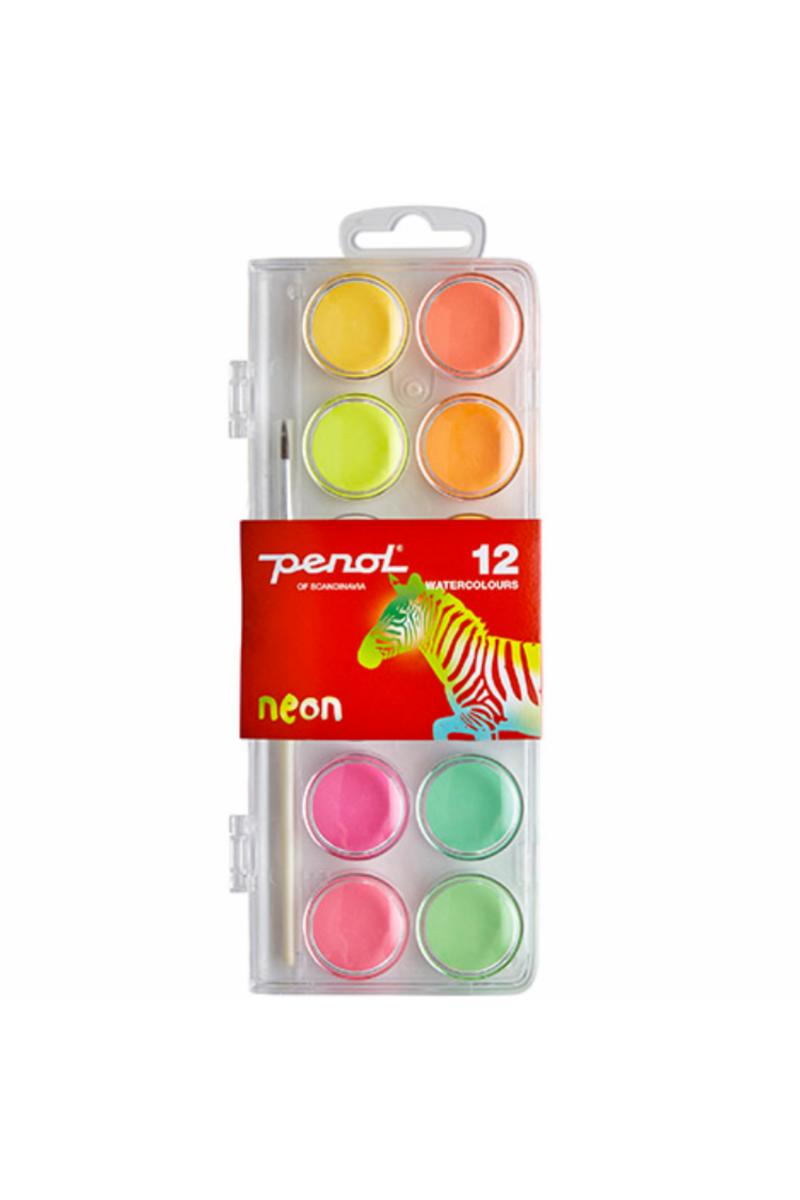 12 neon fargetabletter i skrin. Maleskrin fåes i flere størrelser og inneholder klare, dekkende vannfarger. Alle skrin inneholder pensel.