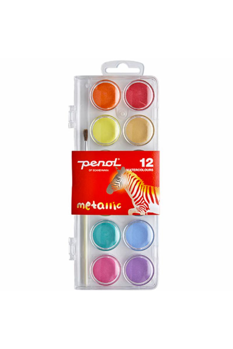 12 metallic fargetabletter i skrin. Maleskrin fåes i flere størrelser og inneholder klare, dekkende vannfarger. Alle skrin inneholder pensel.