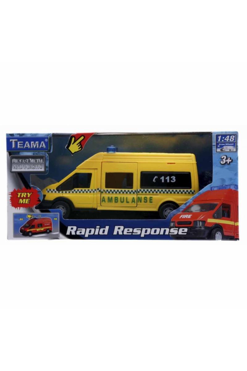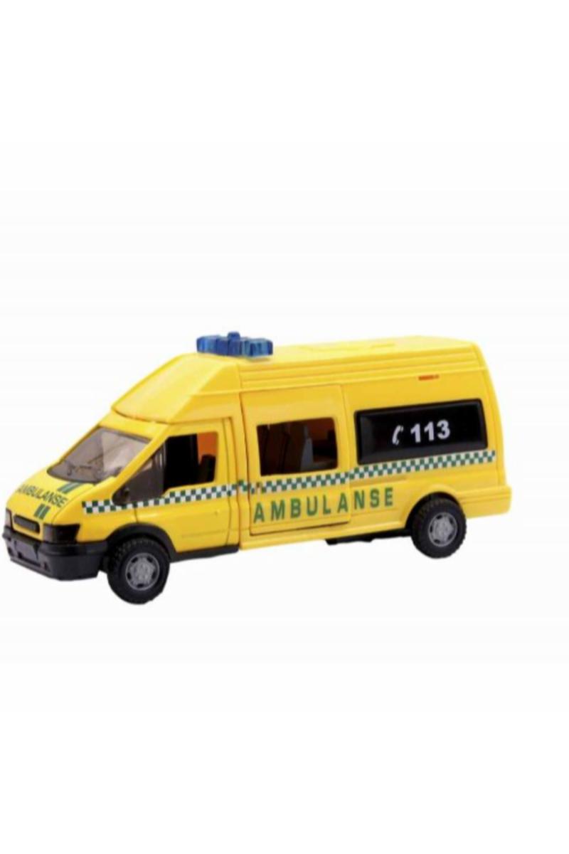Stilig gul ambulansebil med lys og lyd. Bilen har norsk tekst og nødnummer og er lik ambulanser som kjører i norske gater. Bilen er 16 cm lang med sidedør som kan åpnes og lukkes.