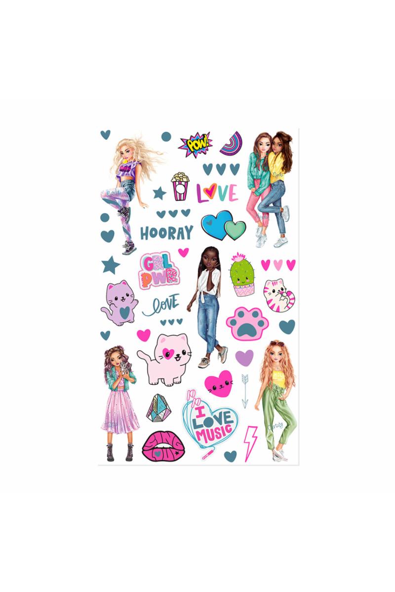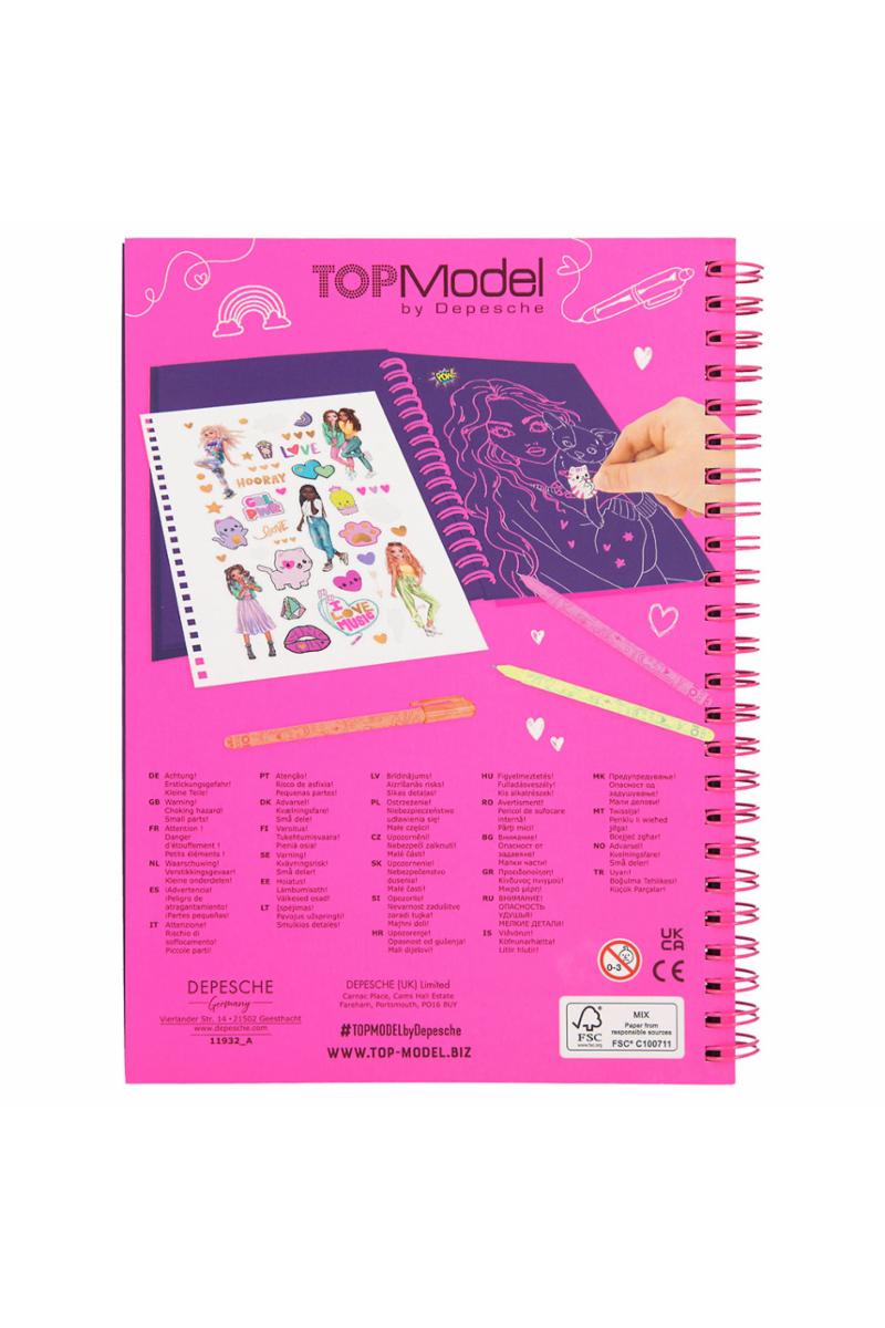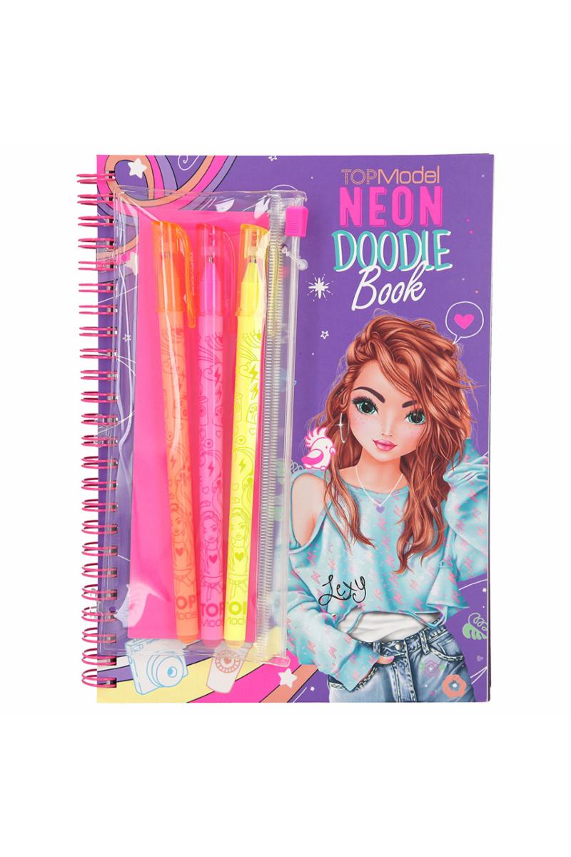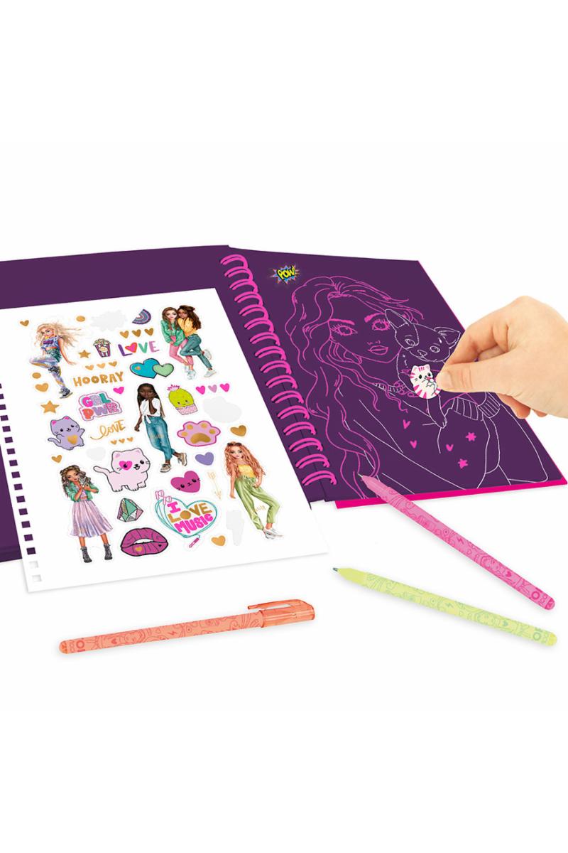 Aktivitetsbok Doodle Book TopModel med farget papir med maler til å fargelegge med de 3 neonfargede tusjene som følger med. Inkludert et ark med kule stickers.