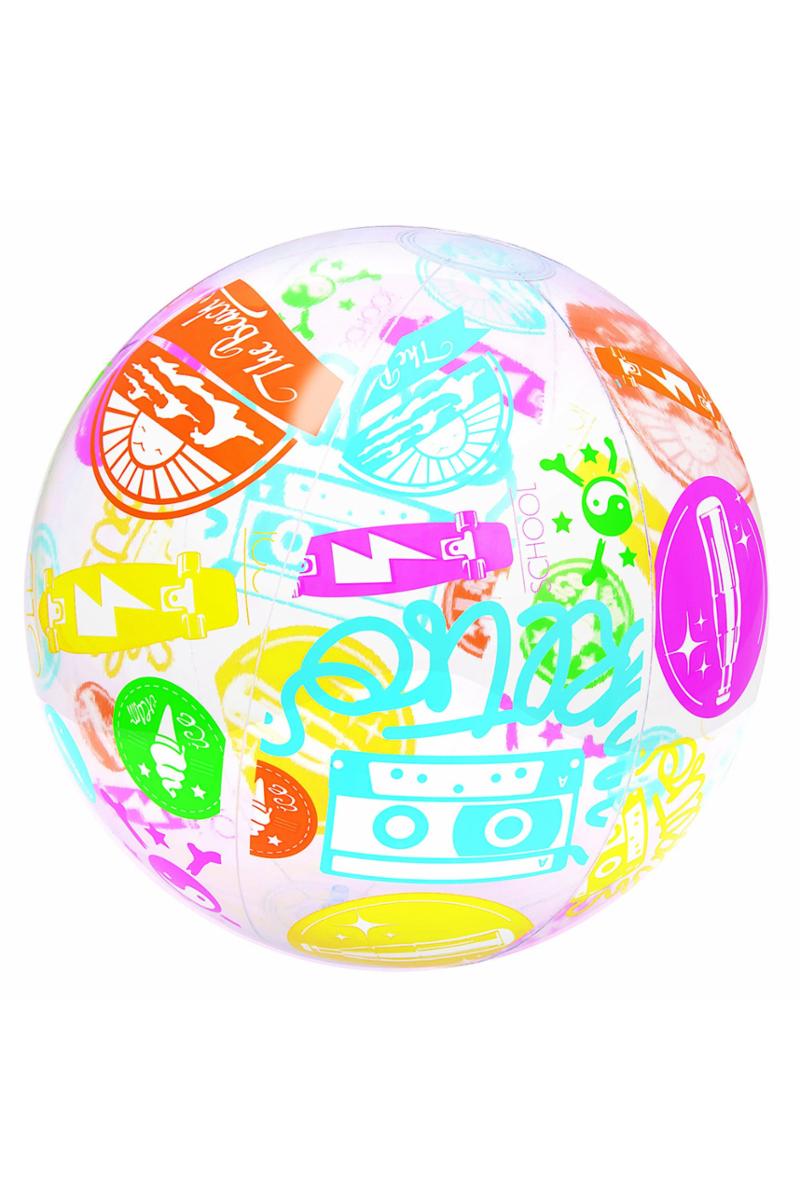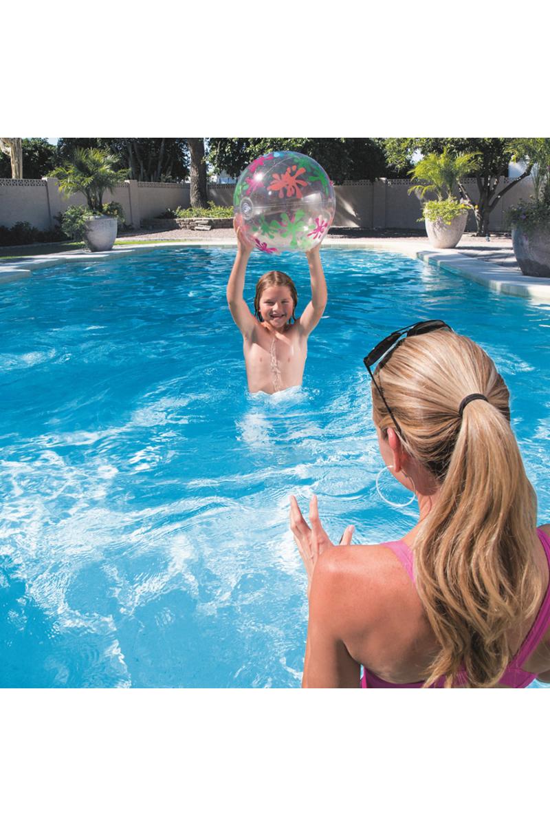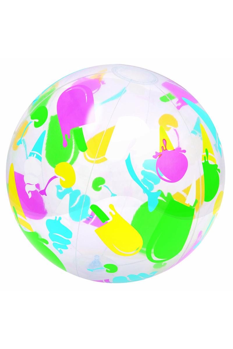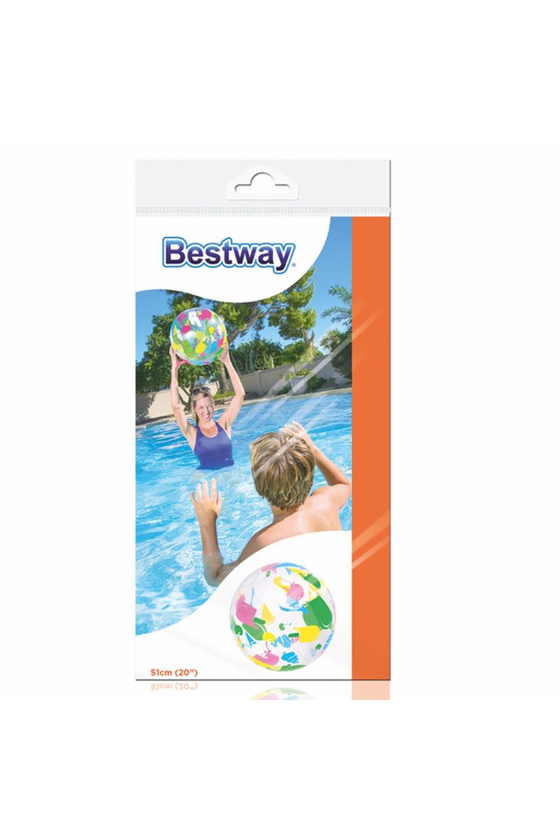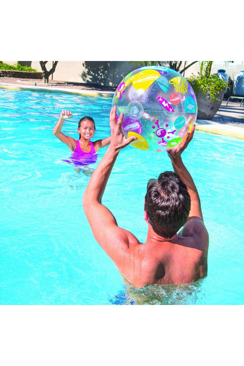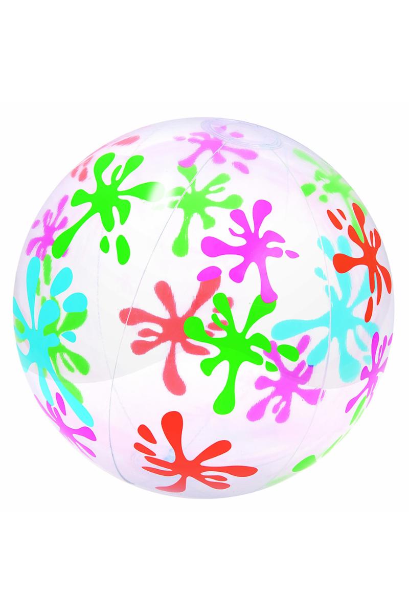 Stor badeball fra Bestway med fargerike mønstre på gjennomsiktig bakgrunn.