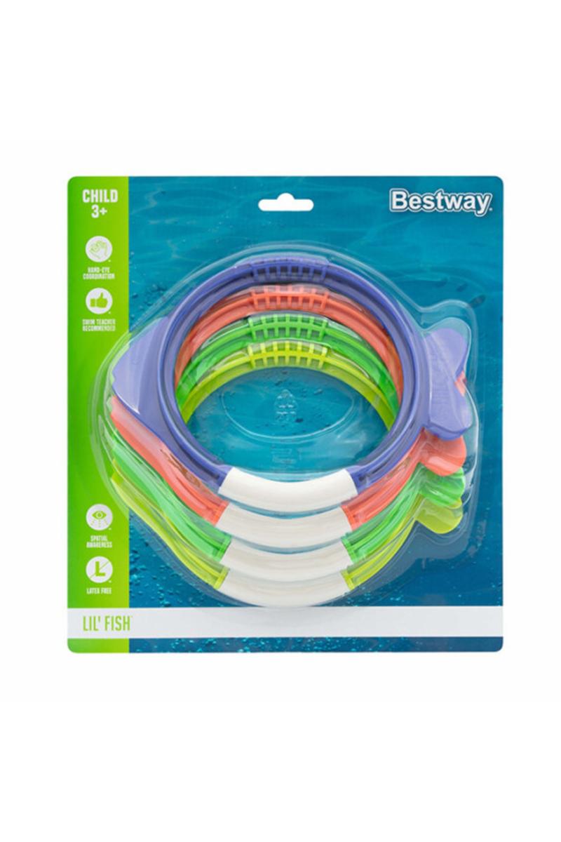 Kast disse Bestway® Lil' Fish™ dykkeringlekene i bassenget og se barna dine dykke ned for å hente dem fra bunnen av bassenget! For en ekstra utfordring kan barna dine også prøve å fange dem før de når bakken. Disse dykkerringene anbefales av svømmeinstruktører da de fremmer selvtillit og koordinasjon i vannet. I tillegg gjør de lyse fargene dem enkle å oppdage og fange - perfekt for lek og perfeksjonering av svømmeferdigheter.