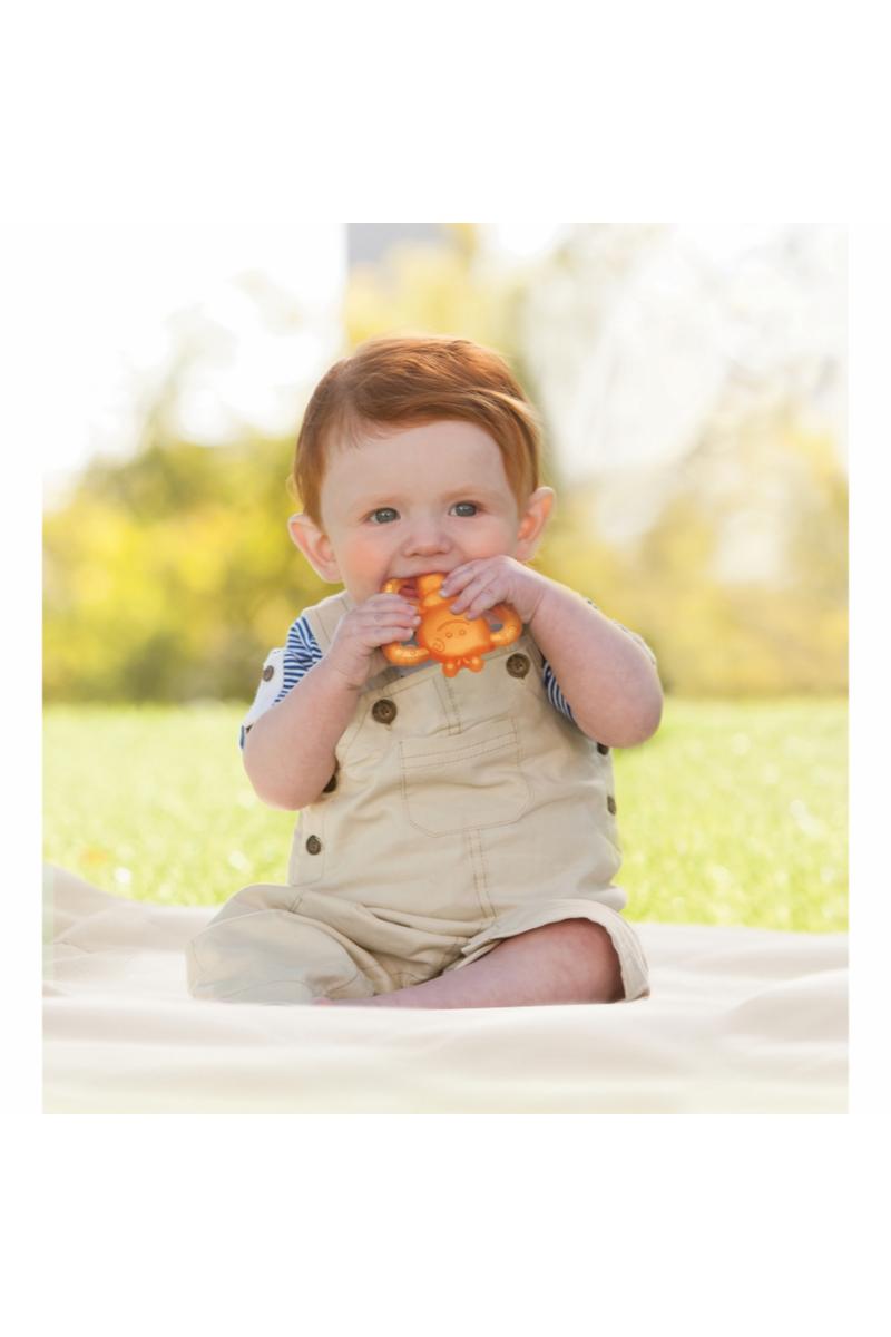 Berolig babyens ømme tannkjøtt med denne myke, teksturerte båndet. Sirkulær design er lett for små hender å gripe og holde.