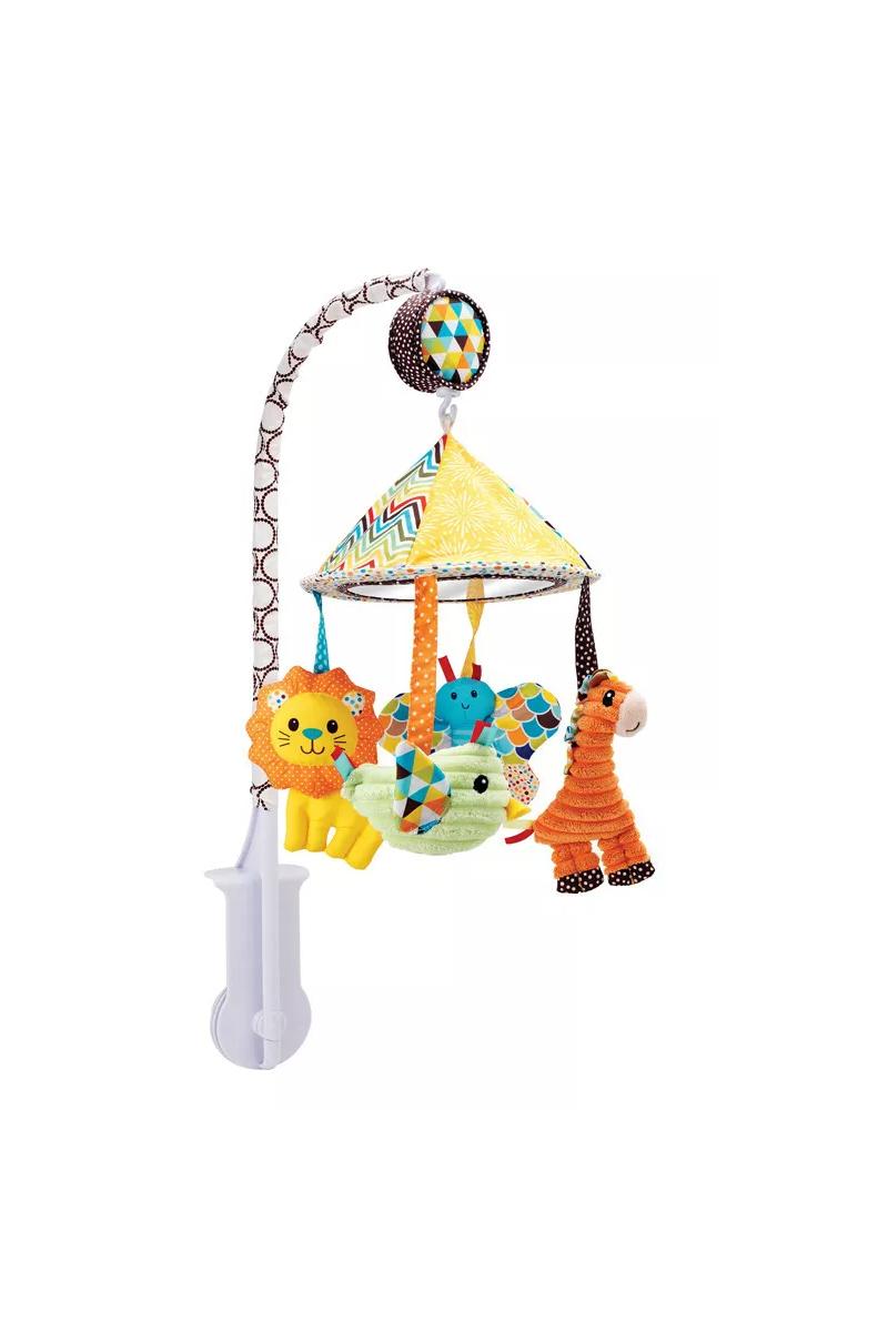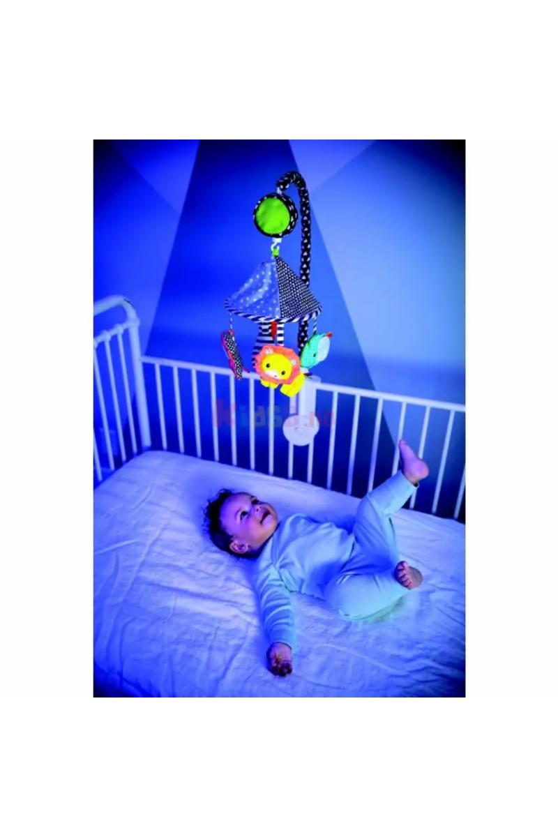 Fra fødselen av kan denne nydelige musikkboksen bli en perfekt følgesvenn for babyen din. Den har en 3-minutters melodi som skaper en beroligende atmosfære før leggetid. Med sine fire søte plysdyr — en løve, en sommerfugl, en sjiraff og en fugl — snurrer de langsomt rundt mens de holder babyens oppmerksomhet.