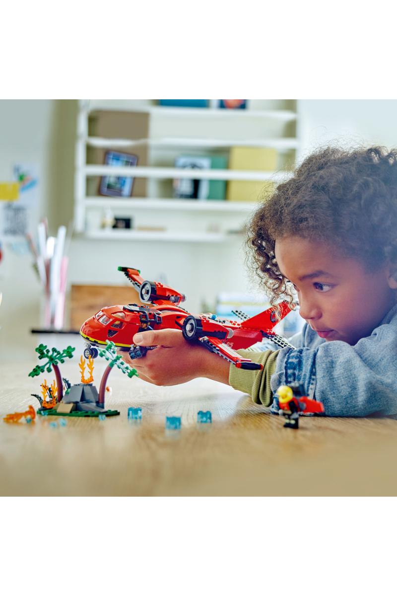 En skog langt unna byen herjes av brann! Nå må det mektige LEGO® City brannflyet til pers. Last om bord flyets slipptanker, og fly av sted for å slukke brannen. Fly inn lavt over flammehavet for å slippe vannmassene over flammene. Ta deretter i bruk de kraftige brannslukkerne, og send ut den futuristiske brannmannen med jetpack for å være med i slukningsarbeidet. Lykke til!