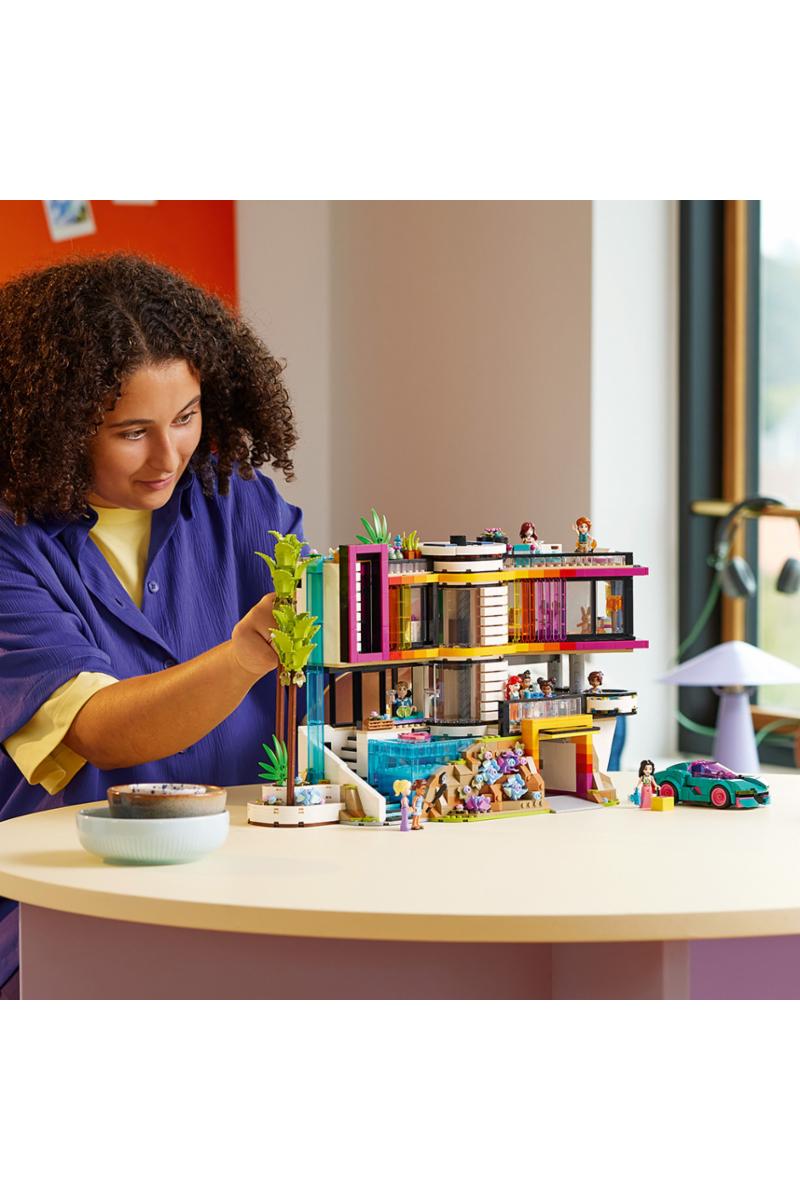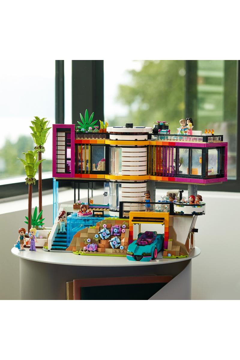 Bygg og still ut det kjempeflotte huset til Andrea – en av de opprinnelige LEGO® Friends vennene, som nå har blitt voksen. Utforsk utendørsområdet med basseng, boblebad og piano, og ta en titt sportbilen som står i garasjen. Ta heisen opp, eller gå inn i Andreas soverom for å teste sengen som går rundt!