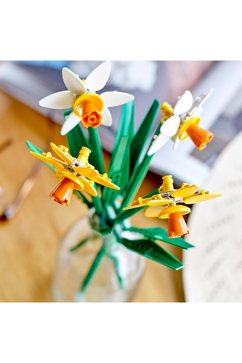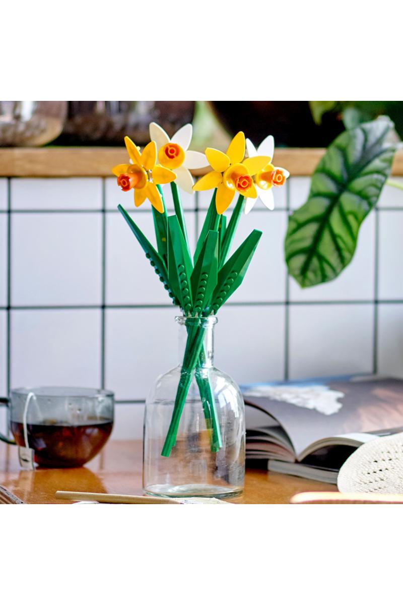 - Vårens farger – disse klossebygde kopiene av ekte påskeliljer i delikat gult og hvitt har grønne stilkermed justerbare blader