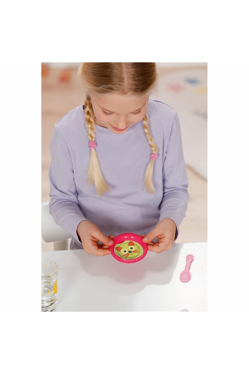 BABY born Emma bringer mye moro inn i barnehagen med sine 10 naturtro funksjoner: drikke, bading, kontrollert pottetrening, lukke øynene ved å snu dukken og mye mer. Hun spiser fra den lille tallerkenen sin, der maten hennes er synlig takket være matmagien. Jeg lurer på hva som skal til i dag?