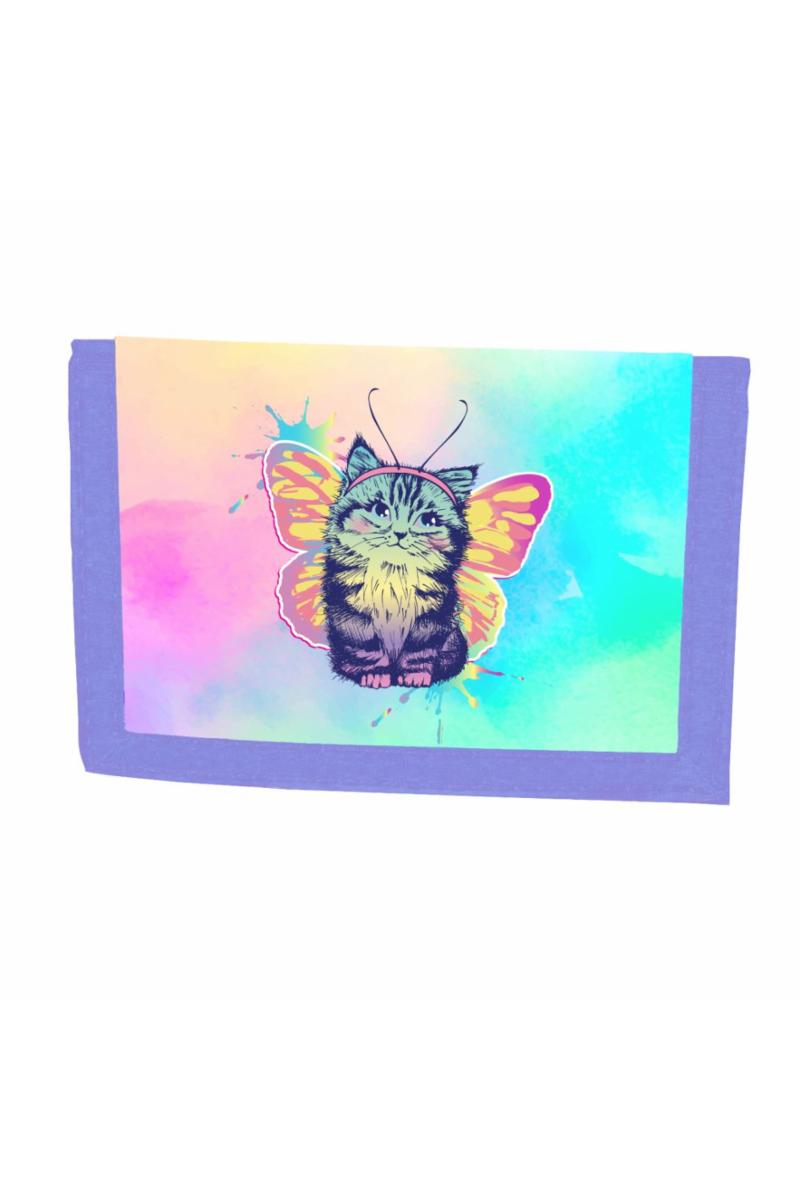Kul lommebok for barn med et søtt motiv av en pus med sommerfuglvinger! Lommeboken har en praktisk glidelåslomme på baksiden for oppbevaring av mynter, og åpnes enkelt med borrelås. Inni finner du flere lommer for å holde kort og småting organisert, samt en egen lomme for sedler. Perfekt for små katteelskere som vil ha en morsom og funksjonell lommebok!