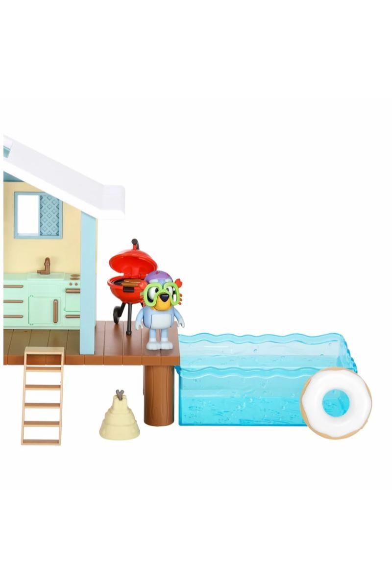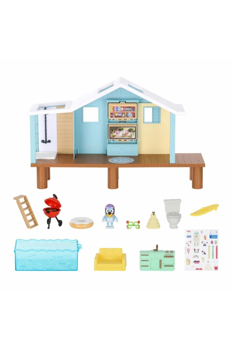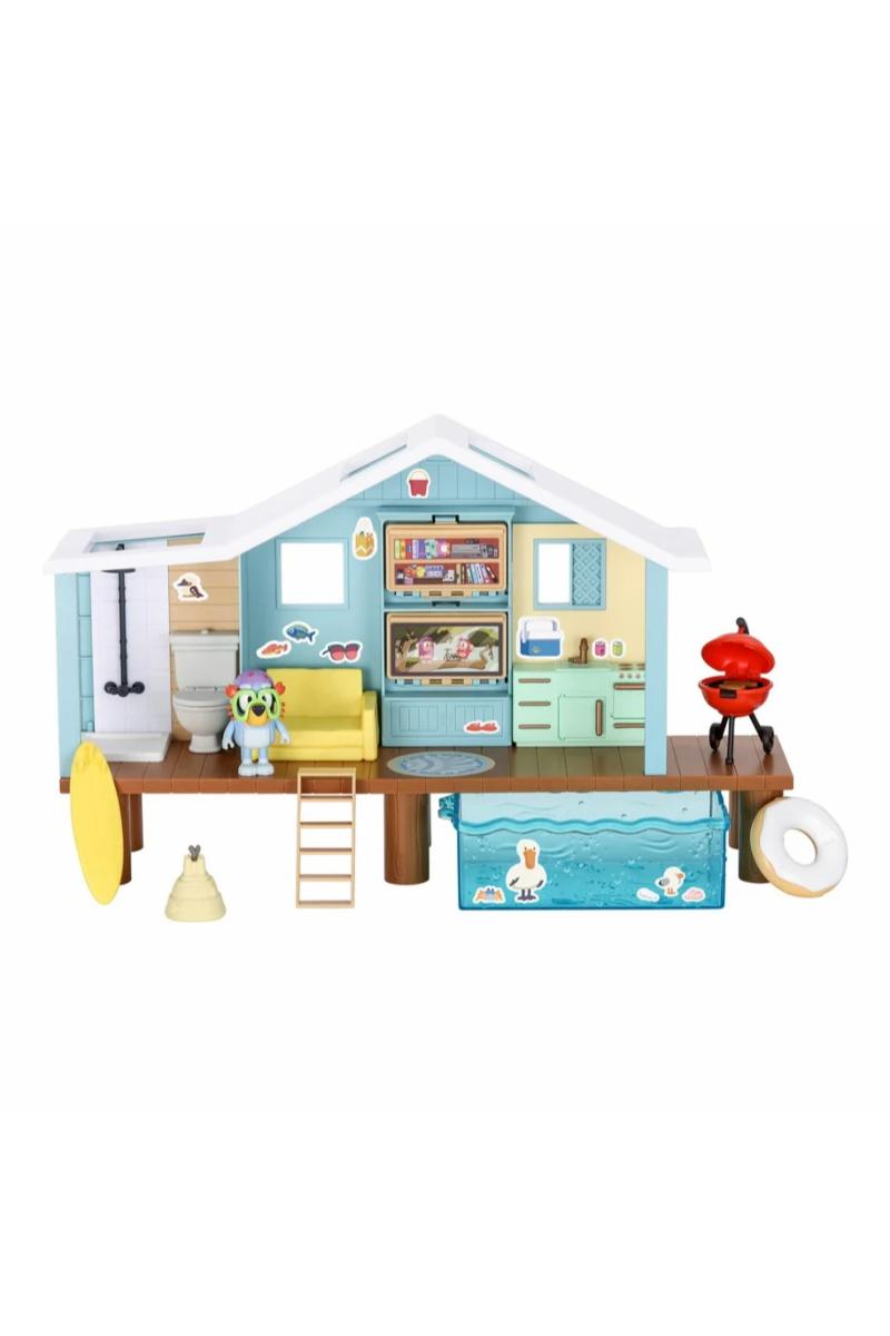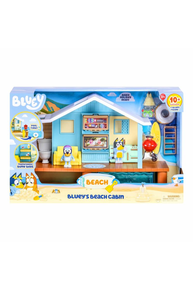 Strandhytte-lekesettet kan også utvides til å inkludere sin egen strand hvor Bluey kan svømme. Settet inneholder mer enn 10 forskjellige leker og et strandtema klistremerkeark for dekorasjon! Bli med Bluey og familien på ferie ved stranden, hvor du kan lage en lat frokost på kjøkkenet, hjelpe Bandit med å grille pølser til lunsj på verandaen, eller ta en pause med Bluey og Bingo i stuen for å se på TV. Eller hvorfor ikke bare ta en svømmetur og utforske under vann?