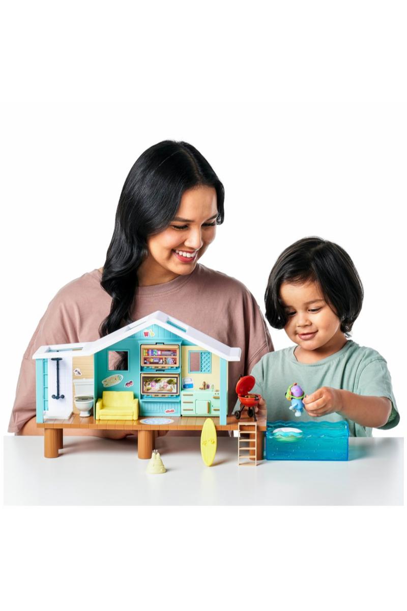 Nå kan barna bli med Bluey på strandferie når hun besøker sin strandhytte! Blueys strandhytte-lekesett er full av morsomme funksjoner som vil gjøre ferien uforglemmelig. Hytten er over 25 cm bred og har forskjellige lekeområder for Bluey-figuren å utforske. Utforsk hytten med toalett og dusj, kjøkken, veranda og en stue som kan gjøres om til et soverom ved å trekke ned hyllene og TV-en!
