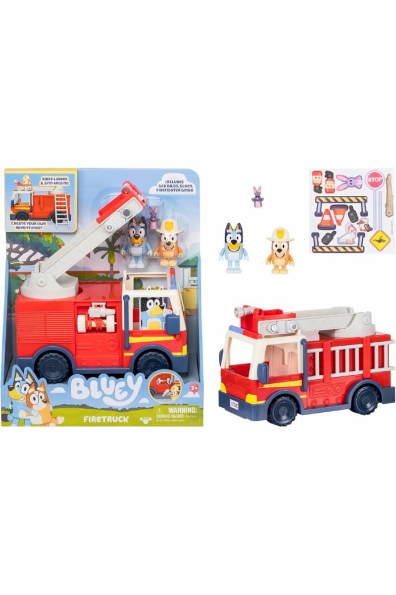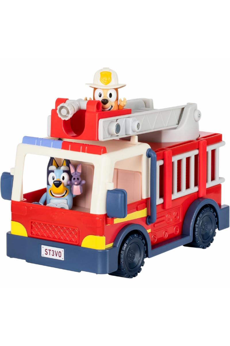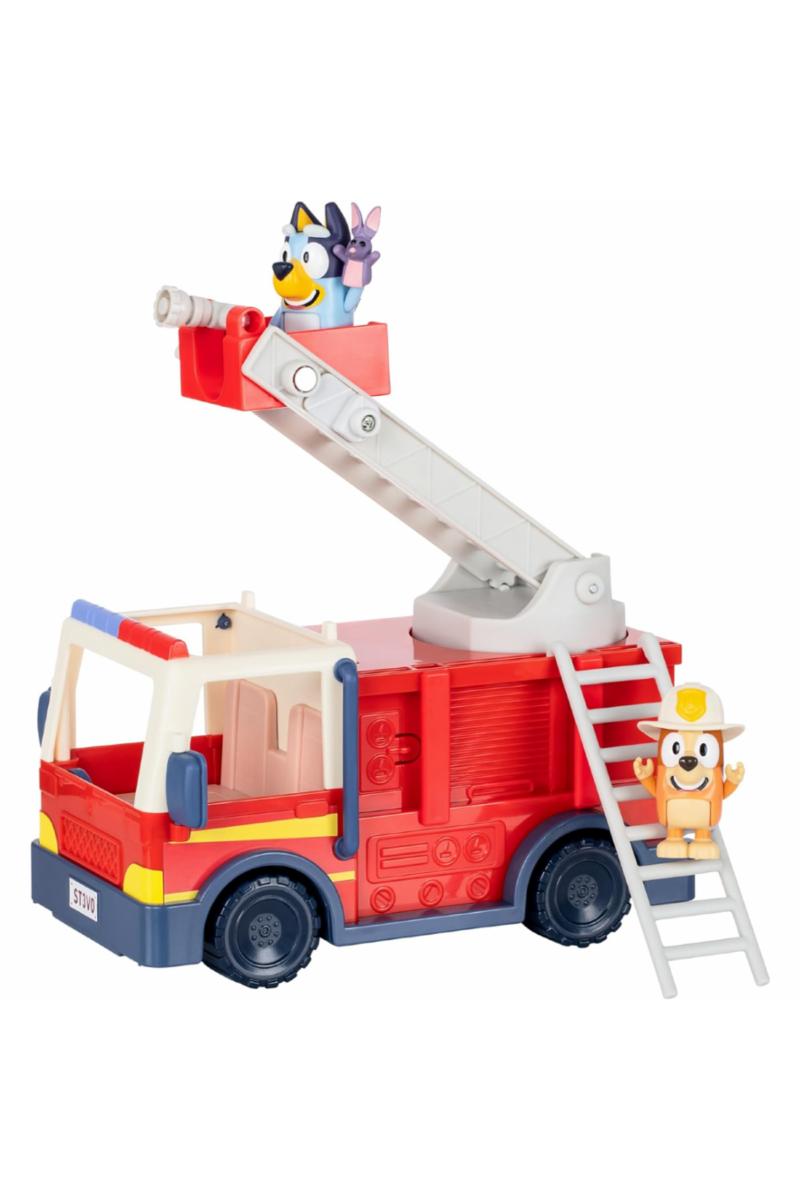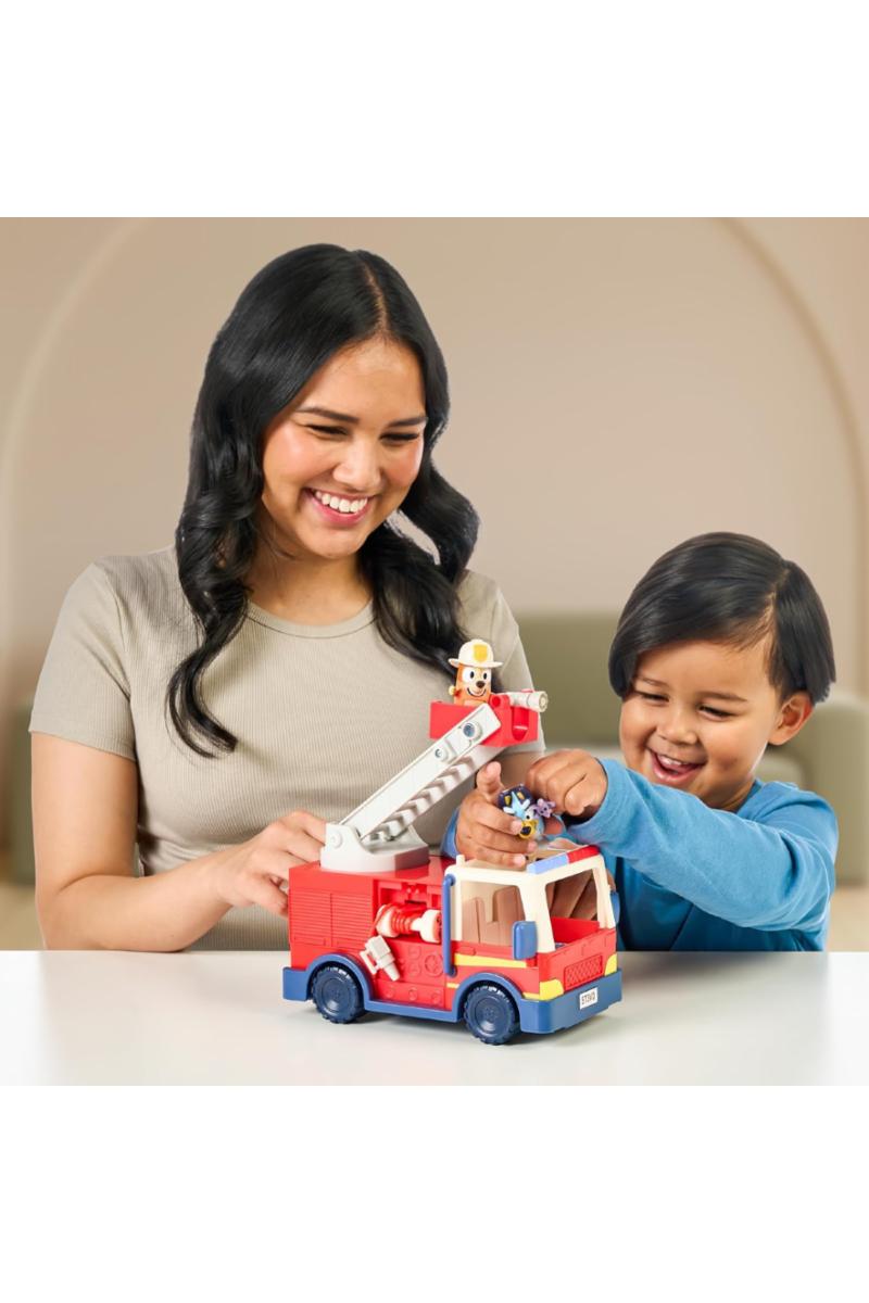 Bli med Bluey og Bingo på et spennende eventyr med deres egen brannbil! Denne leken er full av morsomme funksjoner som barna vil elske. Settet inkluderer to figurer – Brannmann Bingo og Bluey – sammen med et Bob Bilby-tilbehør. Bluey og Bingo kan sitte sammen i førerhytten og rulle av gårde til neste redningsoppdrag. Brannbilen har en uttrekkbar slange, en avtagbar stige på siden, og en stige som kan løftes og roteres, slik at Bingo kan stå på toppen og sprute vann. Det følger også med et klistremerkeark for ekstra moro. Med bevegelige armer og kropper er figurene perfekte for små hender å leke med. Gjenskap favorittøyeblikkene fra TV-serien med denne flotte leken!