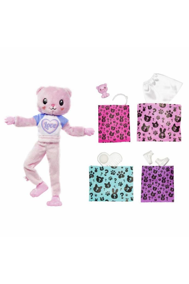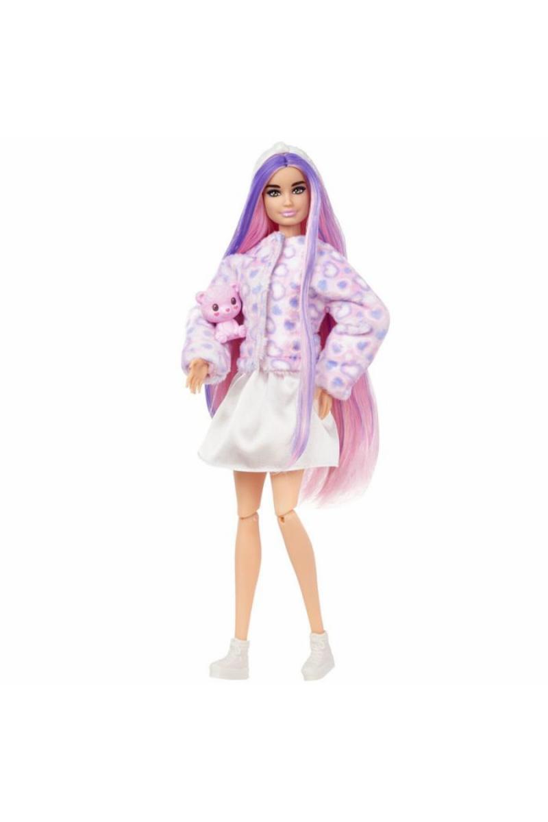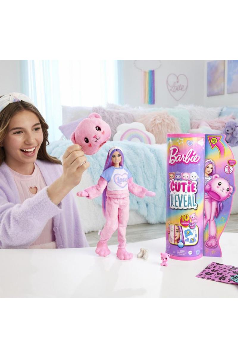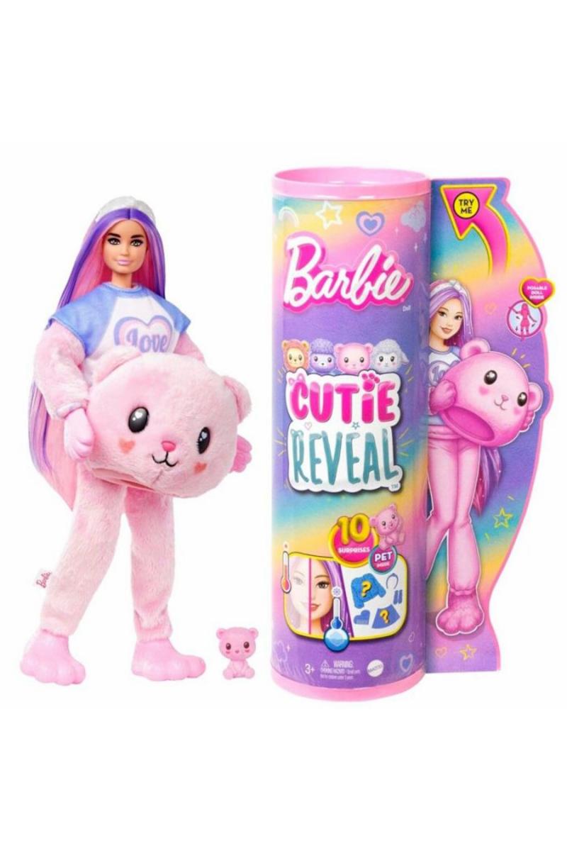 Åpne opp pakken for å avsløre en fortryllende Barbie som gjemmer seg i et koselig teddybjørnkostyme, komplett med en sjarmerende mini teddybjørn! Barbien har et vakkert langt hår som matcher det myke kostymet. Vreng kostymetoppen for å avsløre en varm fleecejakke, og bruk kostymehodet som en koselig seng til den lille mini teddybjørnen. Overraskende forandring venter når du bruker kaldt vann for å gi Barbie lilla striper i håret, samtidig som øynene til mini teddybjørnen lukkes. Gjenopprett originalen med varmt vann. De fire overraskelsesposene inneholder herlige tilbehør, inkludert et satengskjørt, sko, en hårbøyle og en kam, for ekstra lekeglede. Gi barnet ditt en magisk opplevelse med Barbie Cutie Reveal-dukkens teddybjørnkostyme!