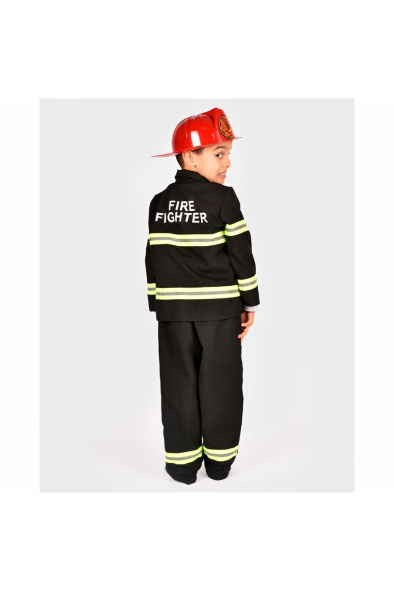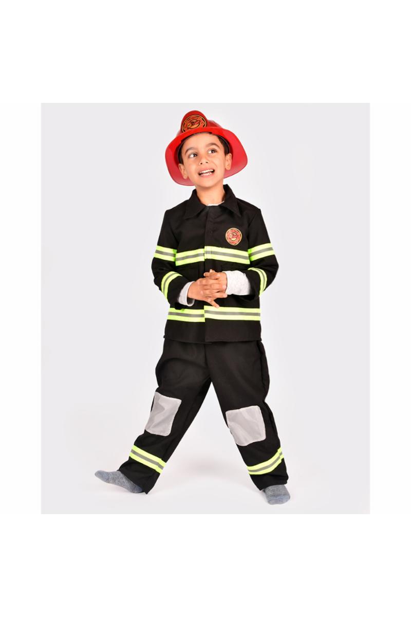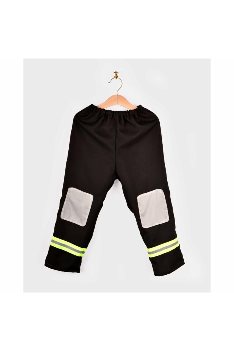 Dette brannmannskostyme er det perfekte utstyret for små helter! Inkludert i settet er svarte bukser, en jakke med frontlommer og en rød plasthjelm. Buksene har elastisk midje for komfortabel passform, mens jakken lukkes enkelt med borrelås foran. Gule og sølvdetaljer gir antrekket ekte brannmannsstil. La fantasien blomstre med dette detaljerte settet, perfekt for lek og eventyr som en ekte brannhelt!