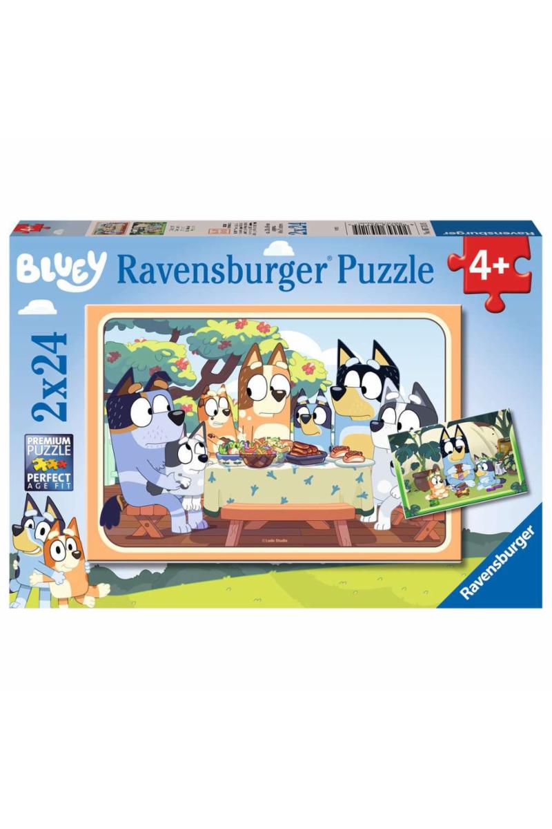 Dette puslespillet er perfekt for små Bluey-fans! Med to forskjellige motiver, hvert med 24 biter, kan barna glede seg over å sette sammen bilder av Bluey og hele familien.