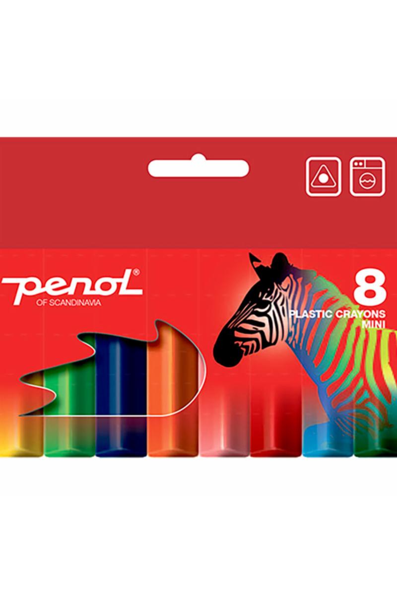 Penol voksfarger for bruk i hjem og skole. Fargene er helt frie for giftstoffer og tungmetaller. All emballasje er laget av resirkulert papp, helt fritt for PVC. Trygt å tegne med, fargen smitter ikke av. 8 mini voksfarger, godt grep for de minste.