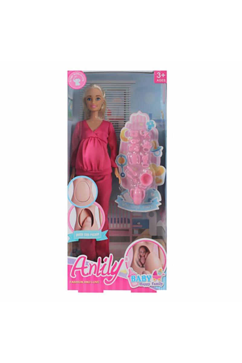 Anlily venter en liten baby! Blir det gutt eller jente? Gravid-dukke med morsomt tilbehør som smokk, tåteflaske, rangle, bamse med mer! 29 cm.