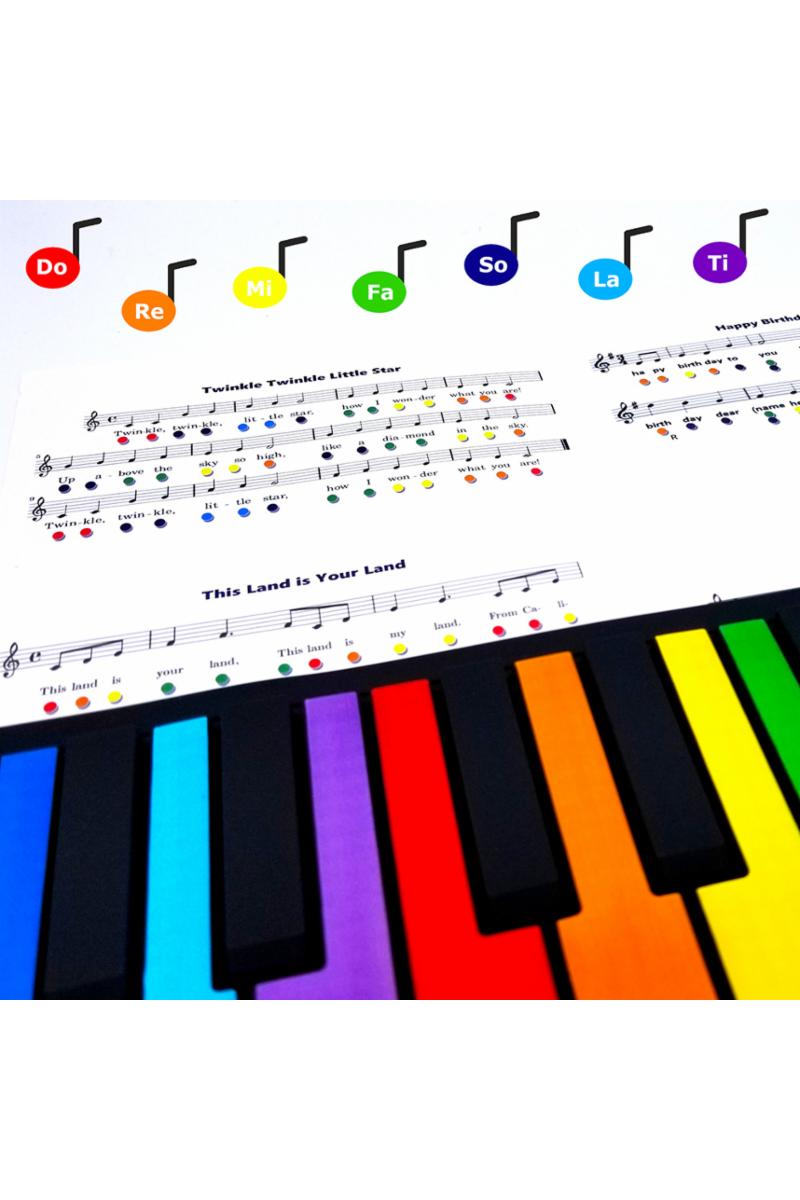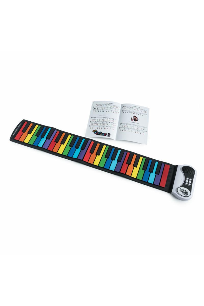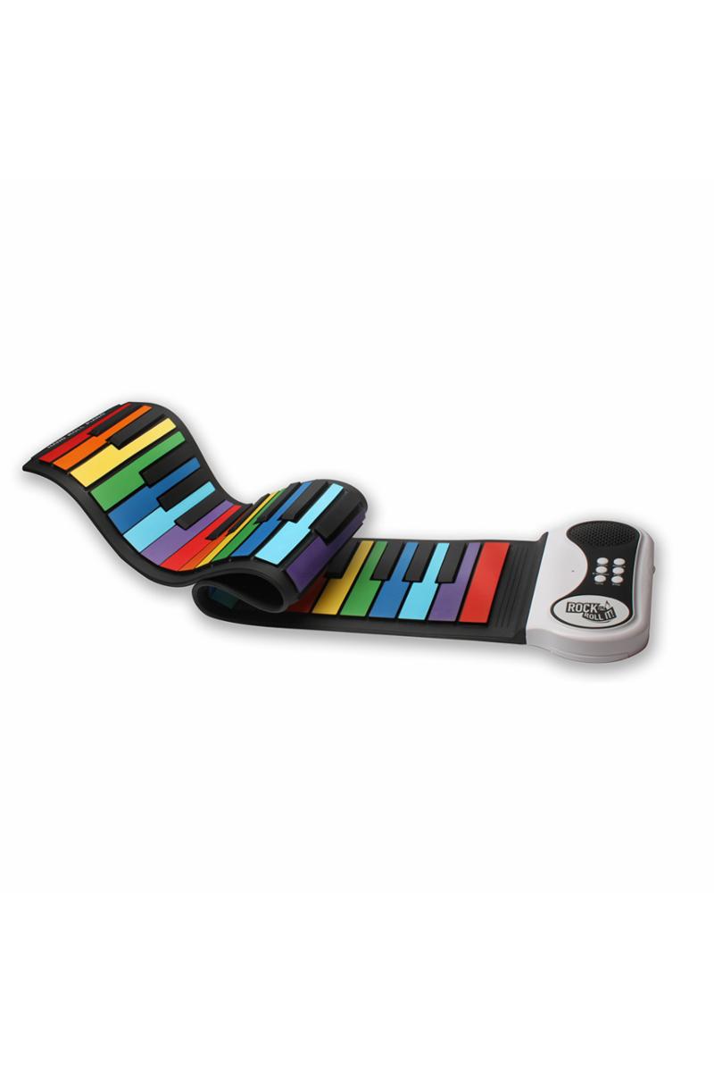 Piano i silikonmatte med mange funksjoner. Du kan enten lytte i hodetelefoner (ikke inkludert) eller bruke den innebygde høyttaleren. Det finnes 6 demosanger, flere ulike piano-og keyboardlyder, volumknapp og innspillingfunksjon. Inkluderer bok med fargekodede melodier og USB-ledning for ladning (stikkontakt er ikke inkludert).