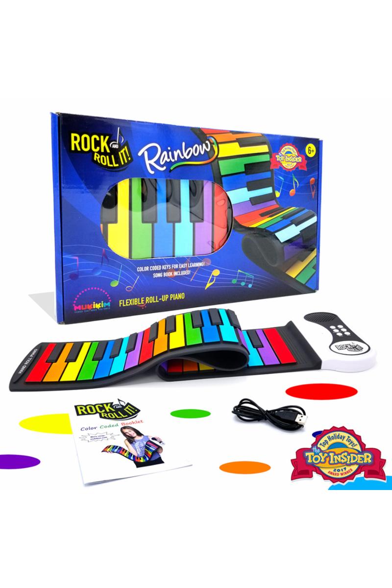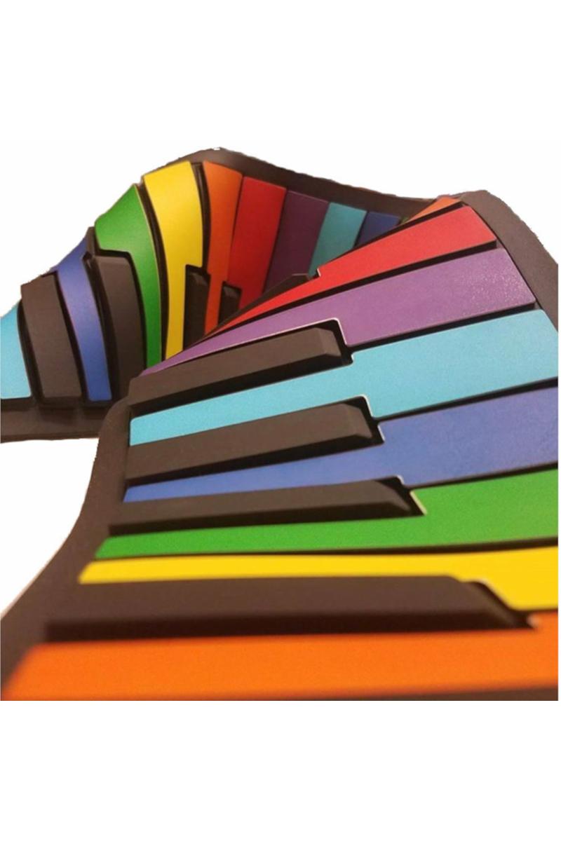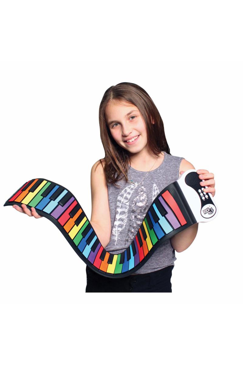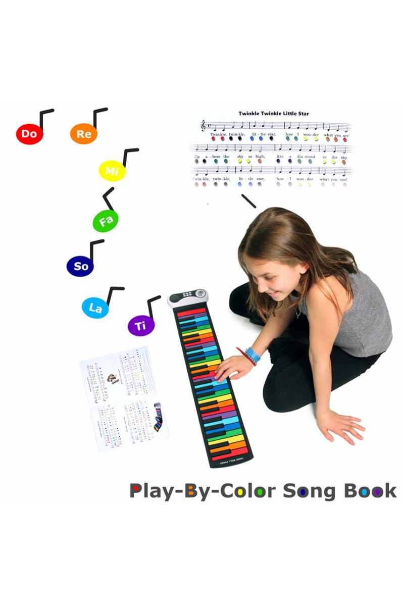 Piano i silikonmatte med mange funksjoner. Du kan enten lytte i hodetelefoner (ikke inkludert) eller bruke den innebygde høyttaleren. Det finnes 6 demosanger, flere ulike piano-og keyboardlyder, volumknapp og innspillingfunksjon. Inkluderer bok med fargekodede melodier og USB-ledning for ladning (stikkontakt er ikke inkludert).