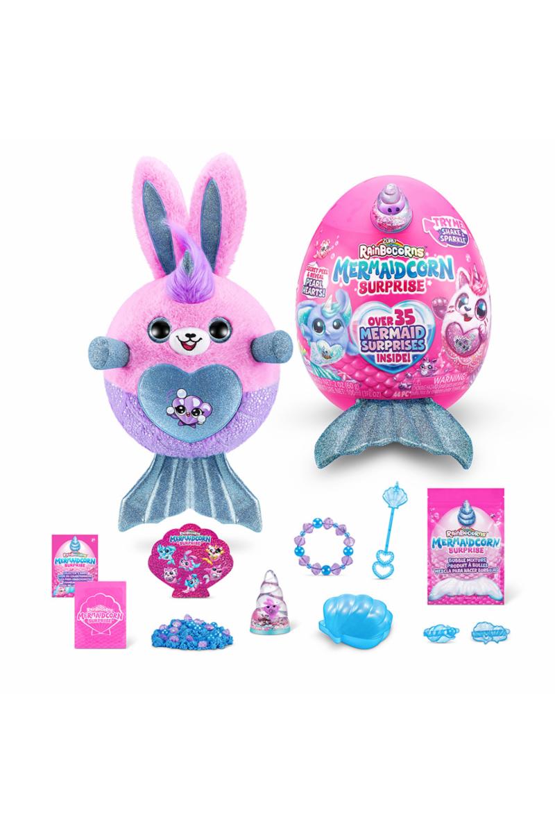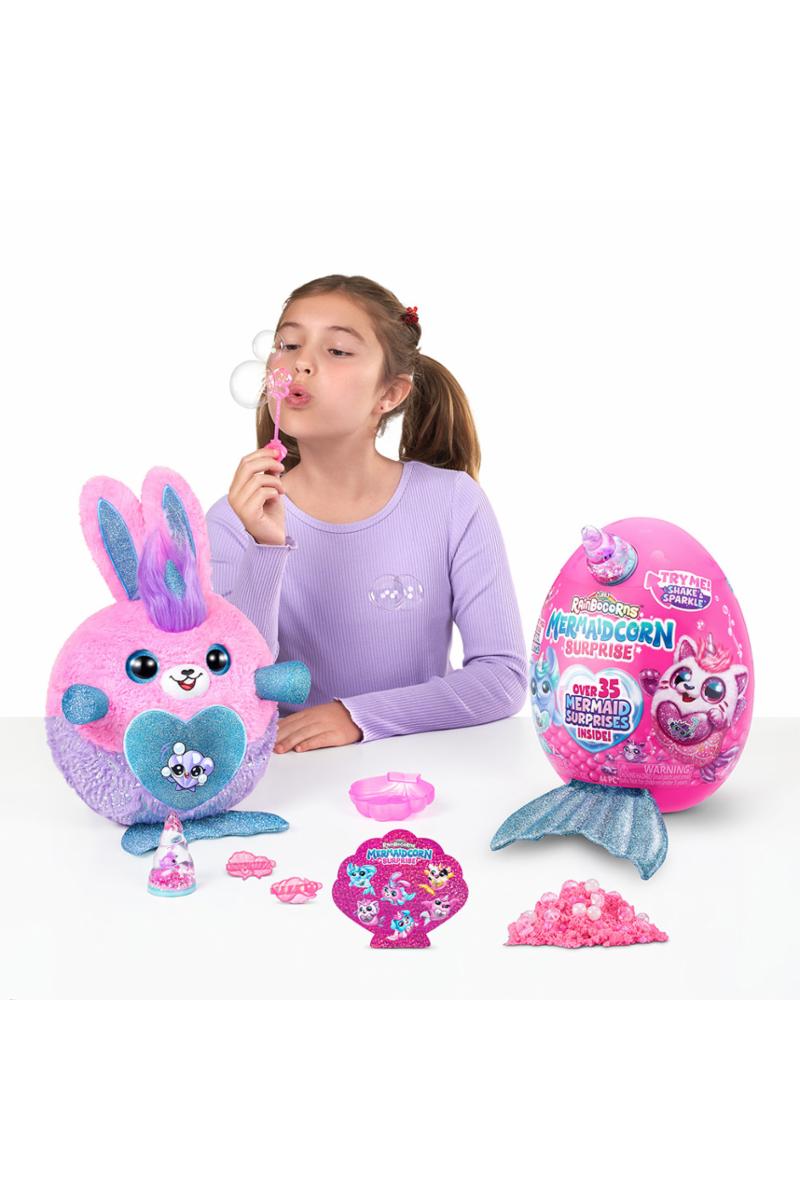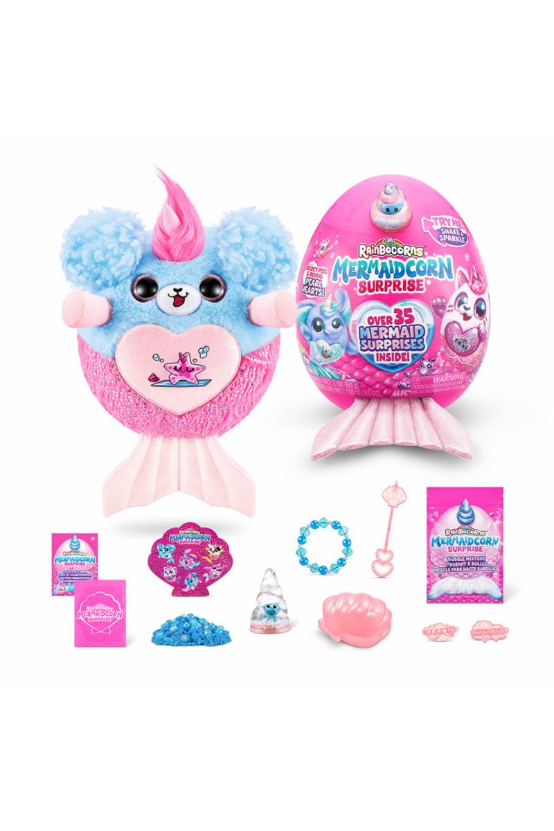 Dykk ned i magiske Rainboville med de helt nye Mermaidcorns! Hvert Mermaidcorn bærer et unikt Peel 'n' Reveal-hjerte som avslører Rainbocornets kjærlighet og over 35 fantastiske havfrue-overraskelser. Disse myke plysjvennene kommer med en glitrende havfruehale og en overraskelsesrik boo-boocorn gjemt inne i vannglobushornet. Klekk ut ditt eget egg for å oppdage en ny, fantastisk venn og utforsk overfloden av skatter i Mermaid Cove. Med seks forskjellige Mermaidcorns å samle på, blir hvert øyeblikk i Rainboville fylt med bølger av spenning og magi