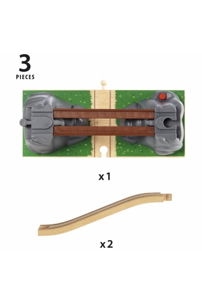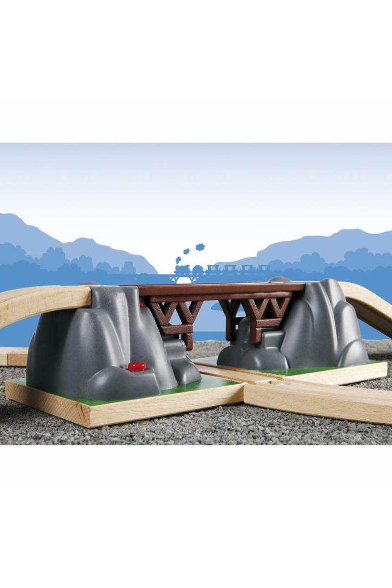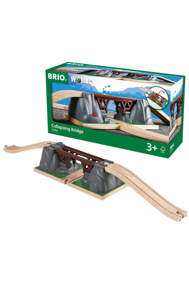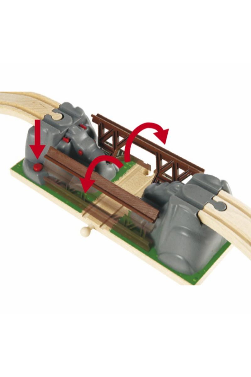Klar, ferdig, kollaps! Trykk på den røde knappen for å rasere broen, slik at ingen tog kan passere før broen felles opp igjen. Bygg broen inn i din eksisterende jernbane og nyt å kjøre tog over og under broen.