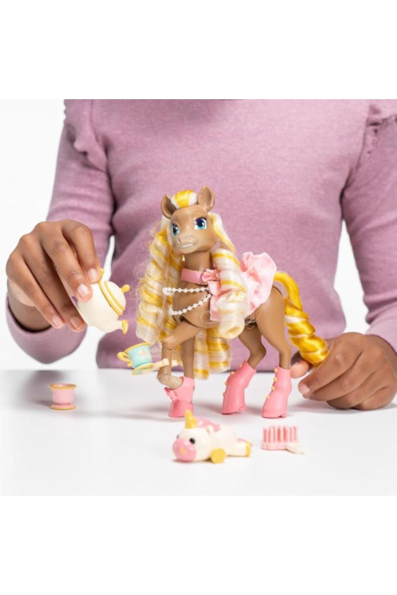 Alle Wild Manes-figurene har bevegelige ledd for historiefortellende posering, og kommer med spesialtilpasset tilbehør som hesteskoformede klips for å holde på de små godbitene og utstyret. Med medfølgende stylingbørster og unike tilbehør kan du virkelig bringe disse eventyrene til live!