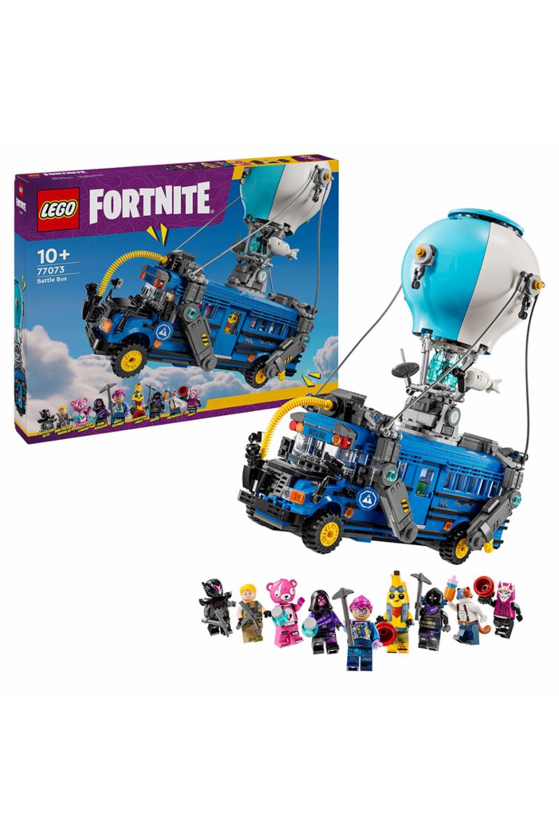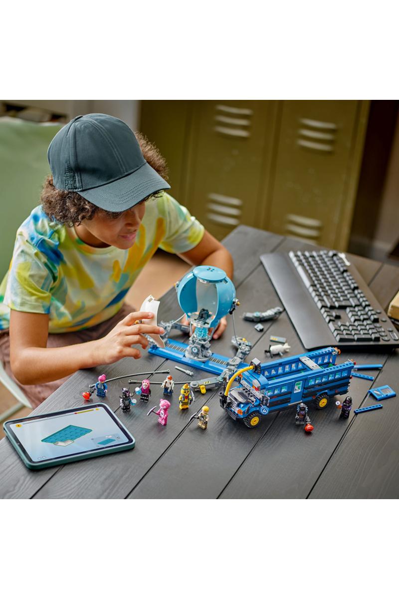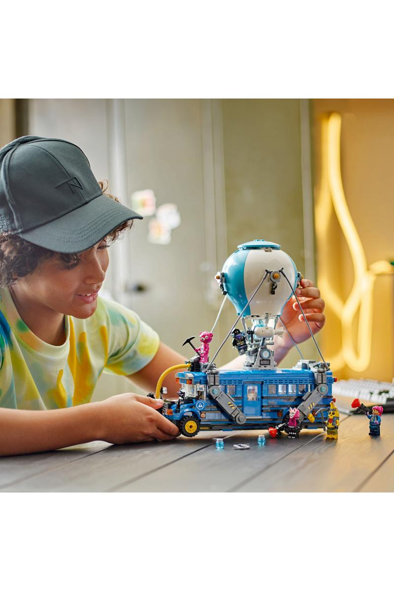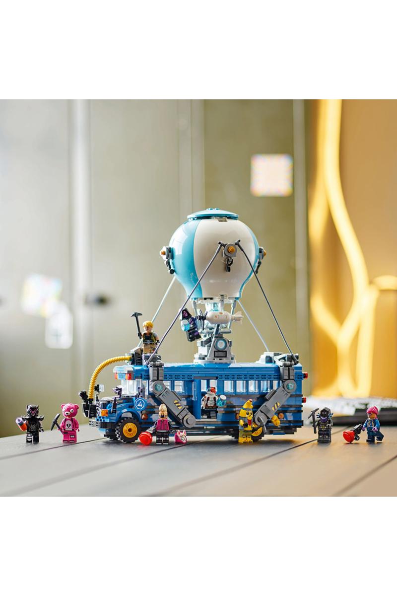 Vil du oppleve eventyrlige LEGO® Fortnite®? Du får en gøyal byggeopplevelse før du legger ut på landeveien med Battle Bus! Modellen er inspirert av bussen fra videospillet og har roterende hjul, avtakbart tak og et tøft varmluftballong-element! Bussen er full av spennende detaljer, og inni finner du både Slurp Juice, Grappler, Pickaxes og Slap Juice samt ni minifigurer fra favorittspillet ditt!